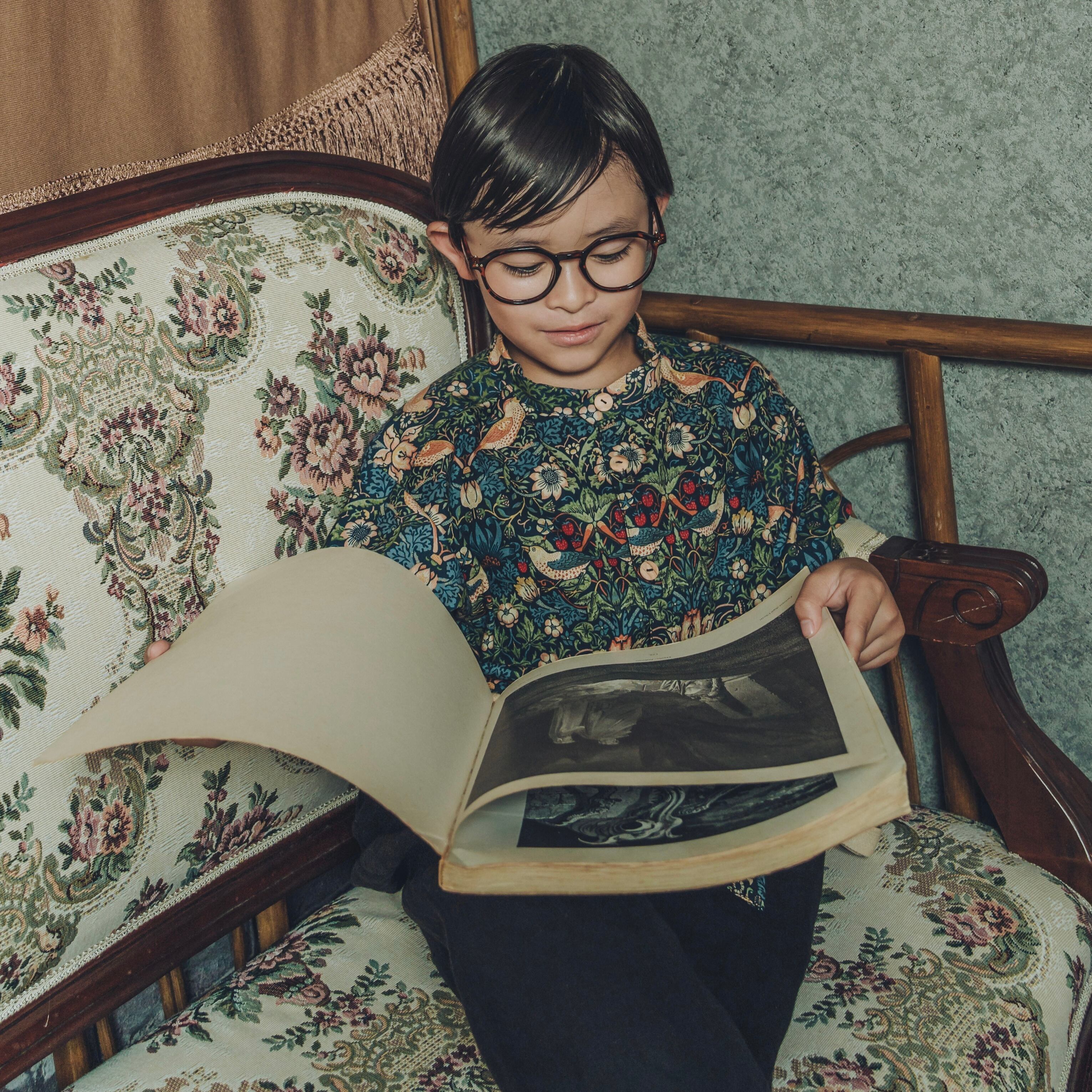 Boys モリスで着飾るスタンドカラーシャツ/ウィリアムモリスいちご泥棒生地使用/総柄/お揃い/ペア